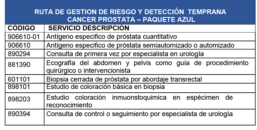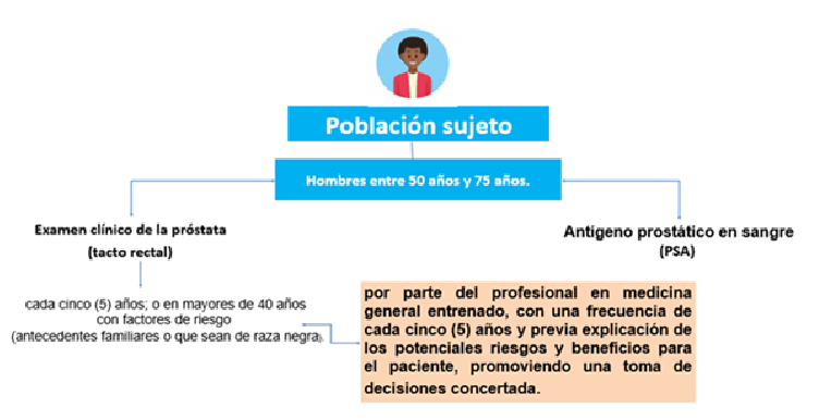 Detectar el cáncer de próstata en estadios tempranos a través de la realización de pruebas de tamización de base poblacional ajustadas a la edad del hombre.